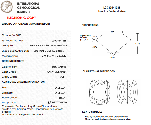 2.22 CT Pink Cushion Cut Lab Grown Diamond | IGI Certified