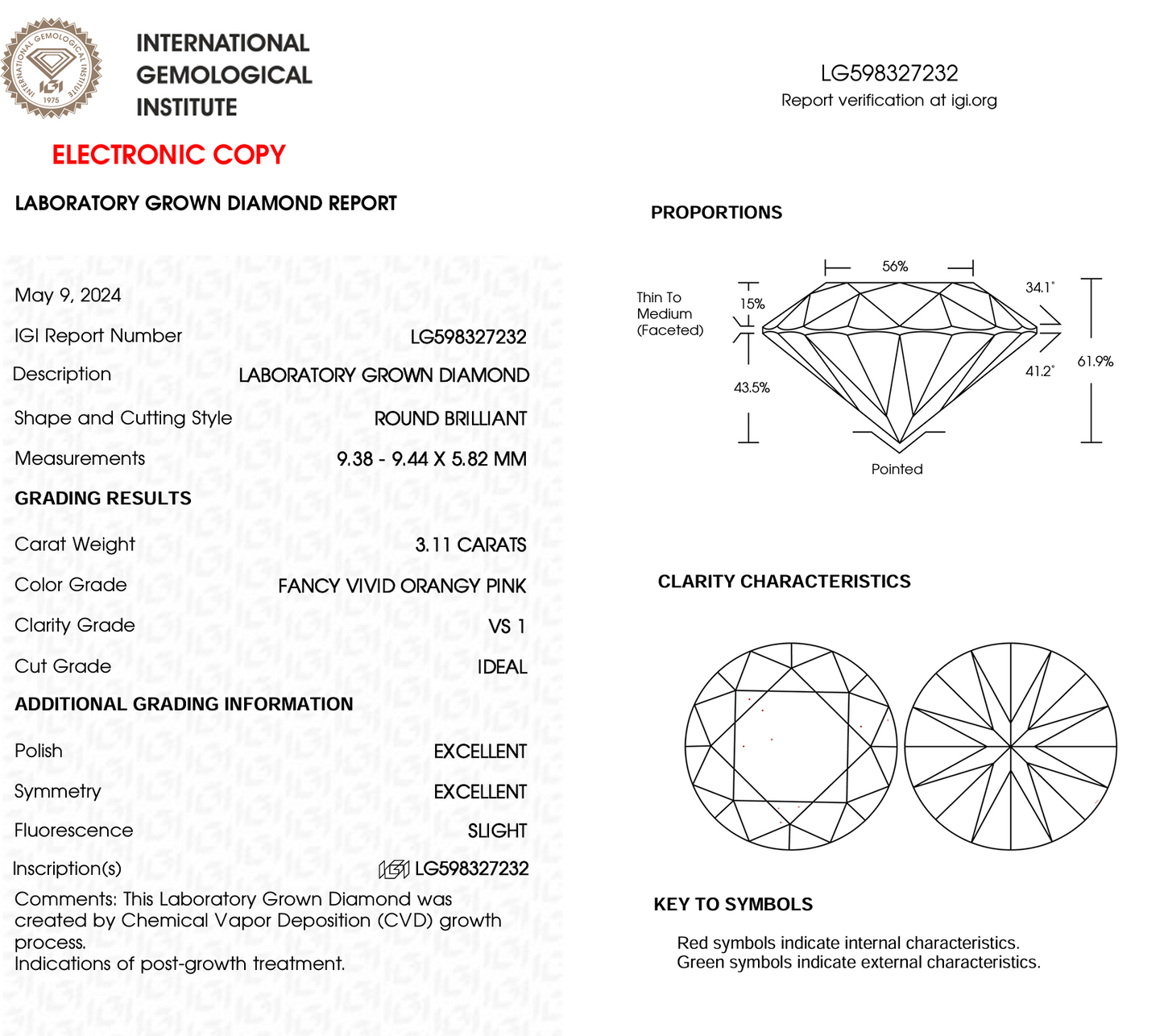 3.11ct Round Fancy Pink Lab Diamond IGI VS1 Sustainable Stone