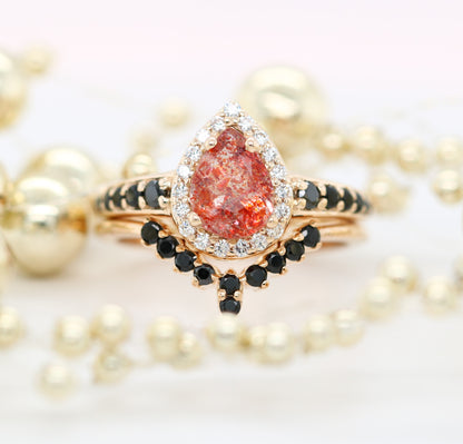 Sun Stone Halo Set Gold Ring and Band Pear Shape Red Galaxy Gemstone Engagement Ring Gift For Her
