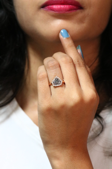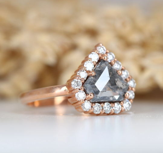 Diamond Shape Salt And Pepper 14K Rose Gold Round Shape Side Stone Halo Engagement Ring For Her