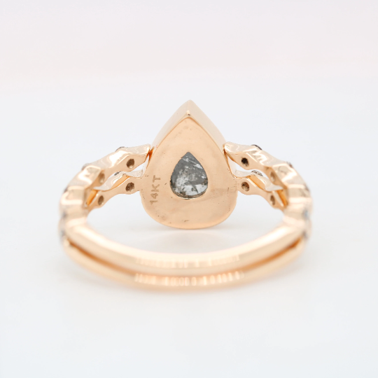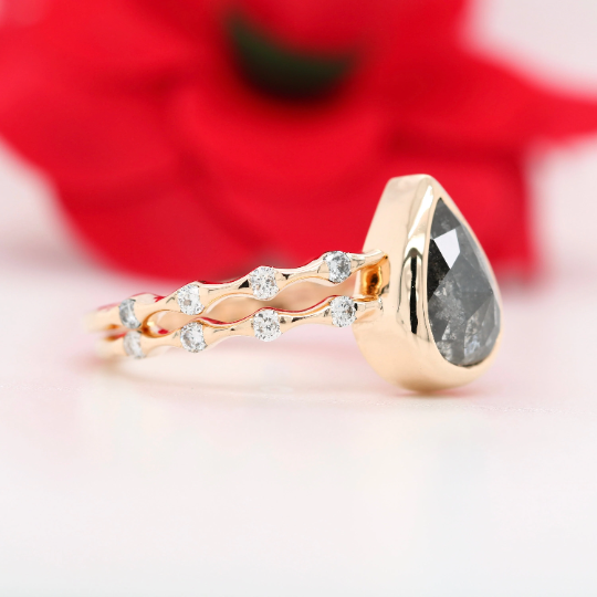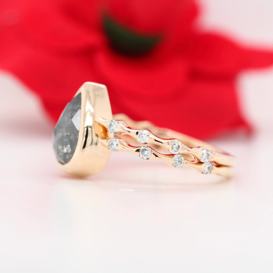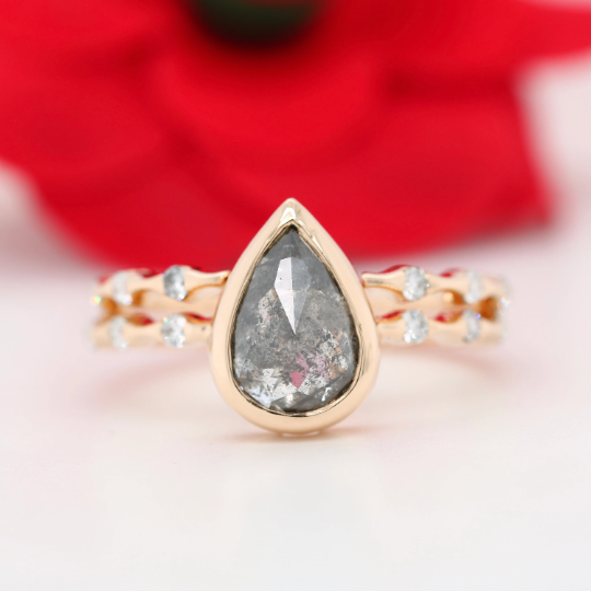 Natural Light Grey Galaxy Pear Cut Bezel Set Salt And Pepper Engagement Diamond Ring with Band