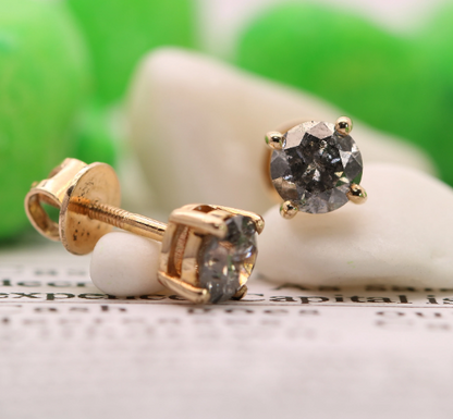 Vintage Natural Round Brilliant Cut Grey Salt and Pepper Unique Stones Diamond Prong Set Gold Minimalist Earrings