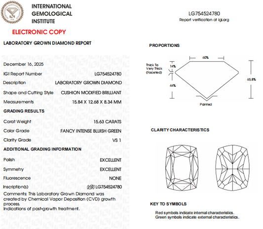 15.63 Carat Blues Green Cushion Cut IGI Certified Lab Grown Diamond For Engagement Ring