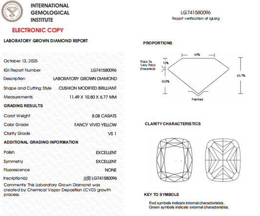 8 CT Square Cushion Cut Lab Created Diamond | Yellow Color, VS1 Clarity, IGI Certified
