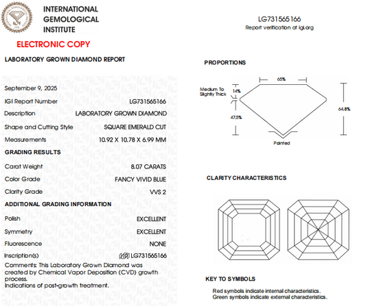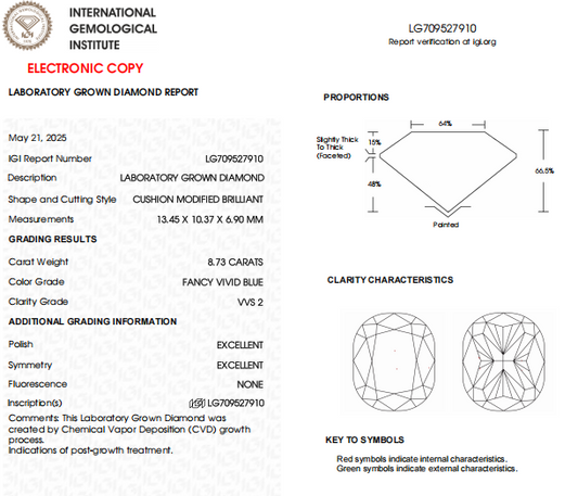 9.52 CT Radiant Cut Lab Created IGI Certified Diamond | Blue Color, VVS2 Clarity